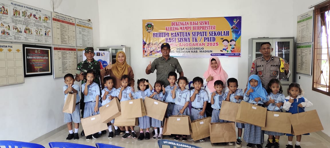 Selasa, 16 Desember 2025, Pemerintah Desa Klecorejo melaksanakan kegiatan pemberian bantuan sepatu sekolah bagi siswa TK/PAUD kurang mampu berprestasi. Kegiatan ini merupakan bentuk dukungan Pemerintah Desa Klecorejo terhadap pendidikan dan kesejahteraan siswa-siswi di desa. Sasaran kegiatan ini adalah 22 siswa dari PAUD Bina Ilmu, PAUD Permata Bunda, dan TK Desa Klecorejo yang kurang mampu namun berprestasi. Bantuan sepatu sekolah ini diharapkan dapat membantu meningkatkan semangat belajar dan mengurangi beban biaya pendidikan bagi orang tua siswa.